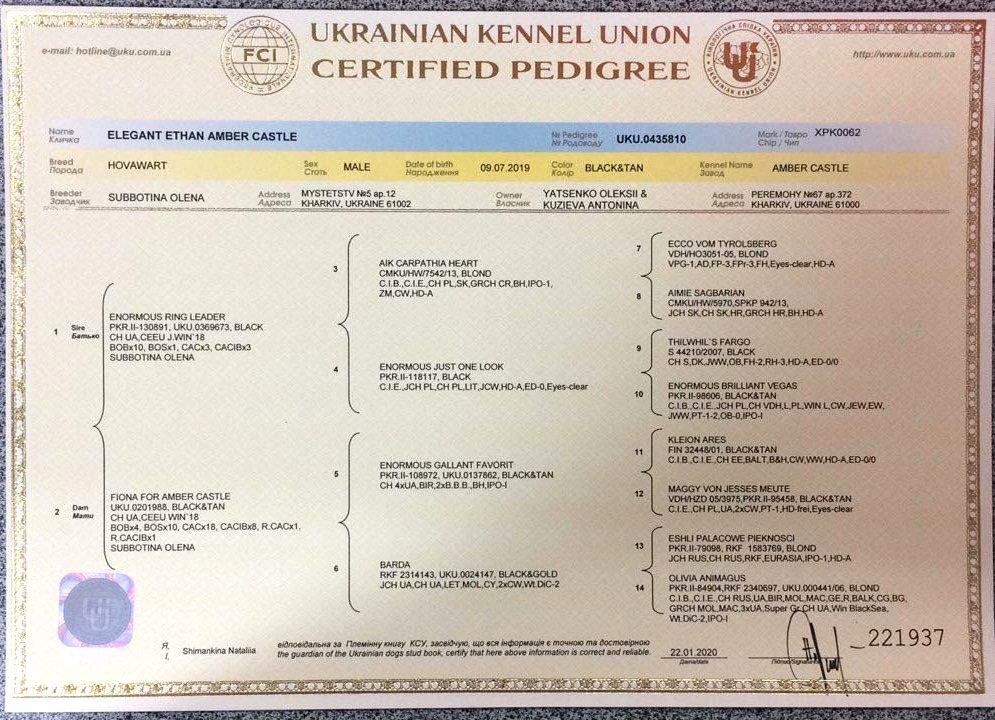 Щенок двух прекрасных представителей украинских ховавартов Fiona for Amber Castle и Enormous Ring Leader.