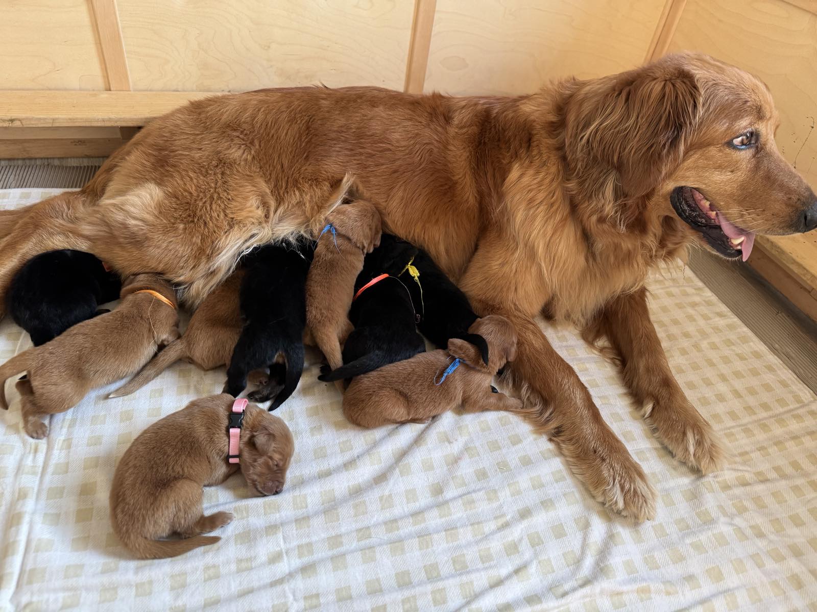 5 блондів хлопчиків, 2 хлопчика чорних з підпалом та 2 дівчинки чорних з підпалом. Цуценята народилися з гарною вагою, всі дуже файні.